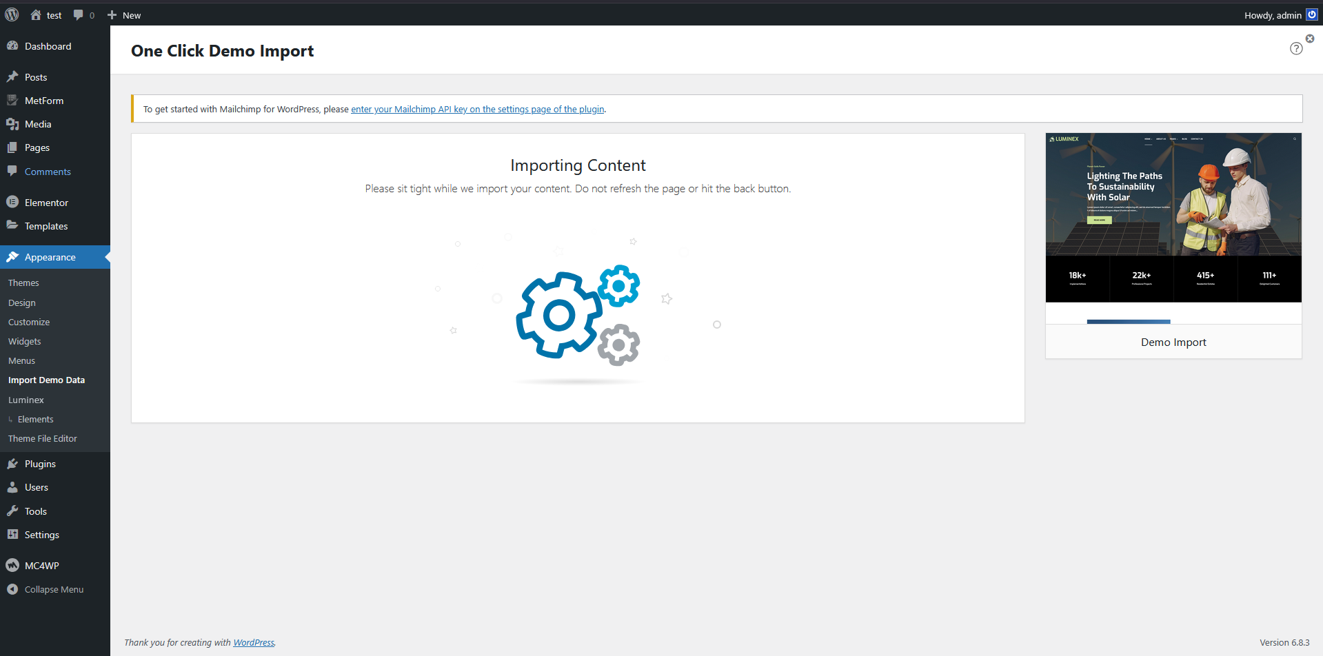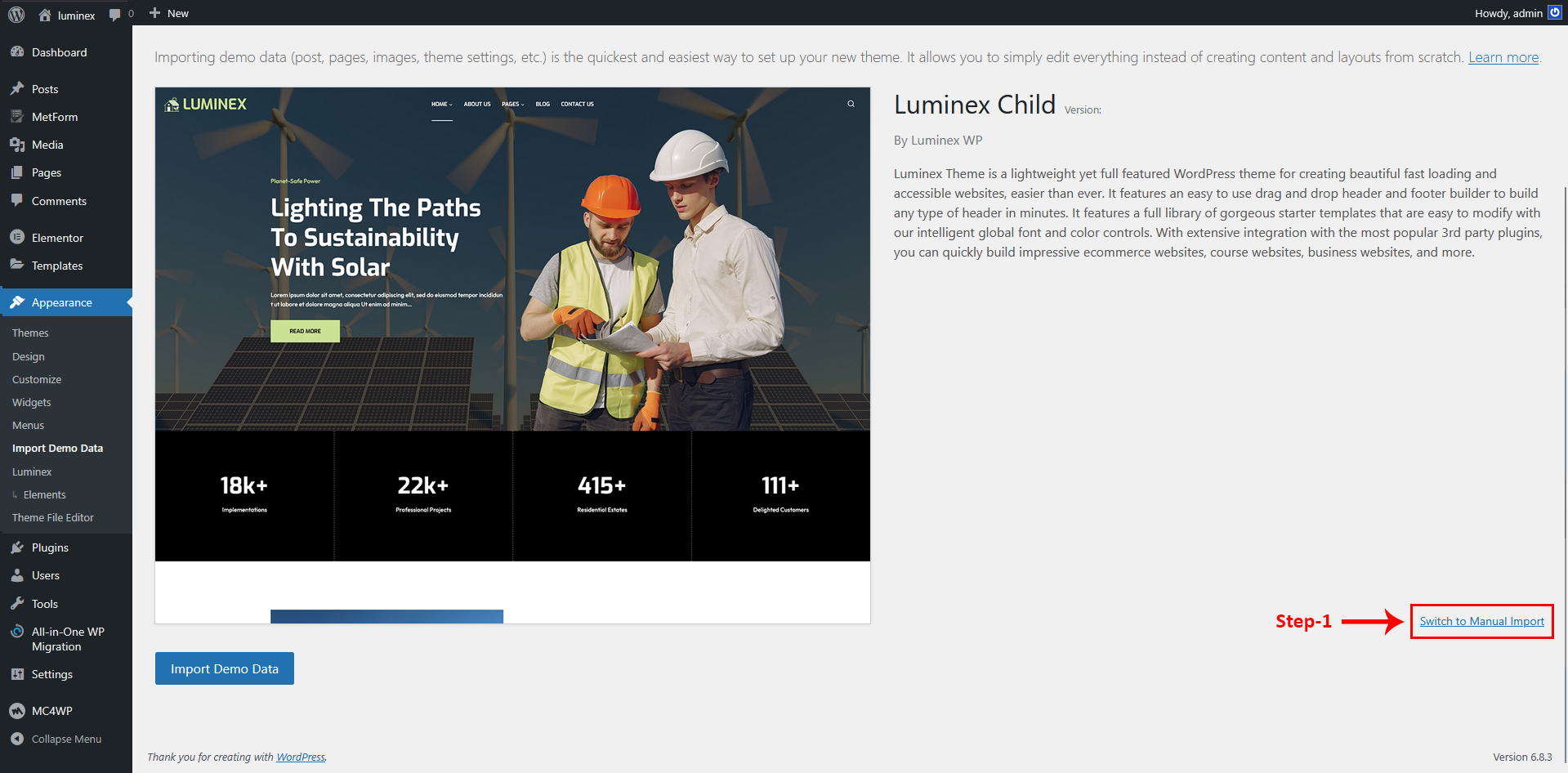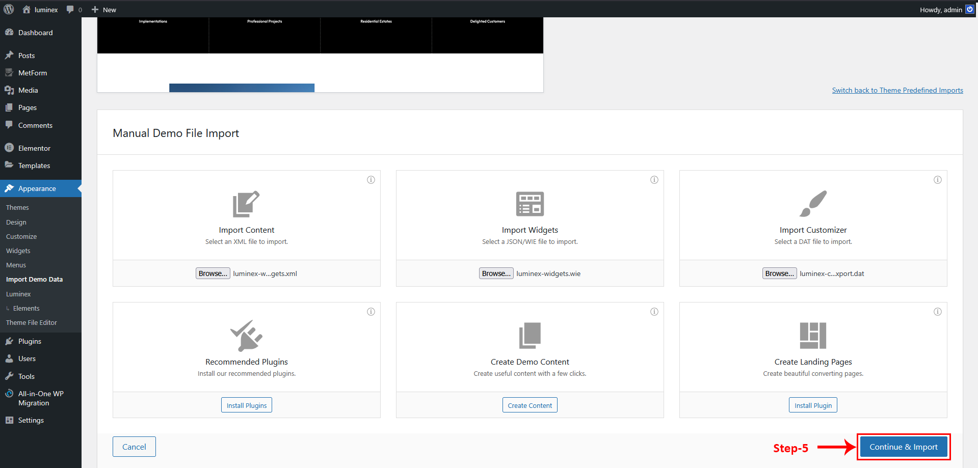 This method will remove all existing content on your website, so it should only be used on a fresh installation. It is the fastest way to set up your site, as everything is done automatically with a single click. If you want your website to exactly match the Luminex demo without having to configure anything manually after importing the data, this method is the most suitable choice.