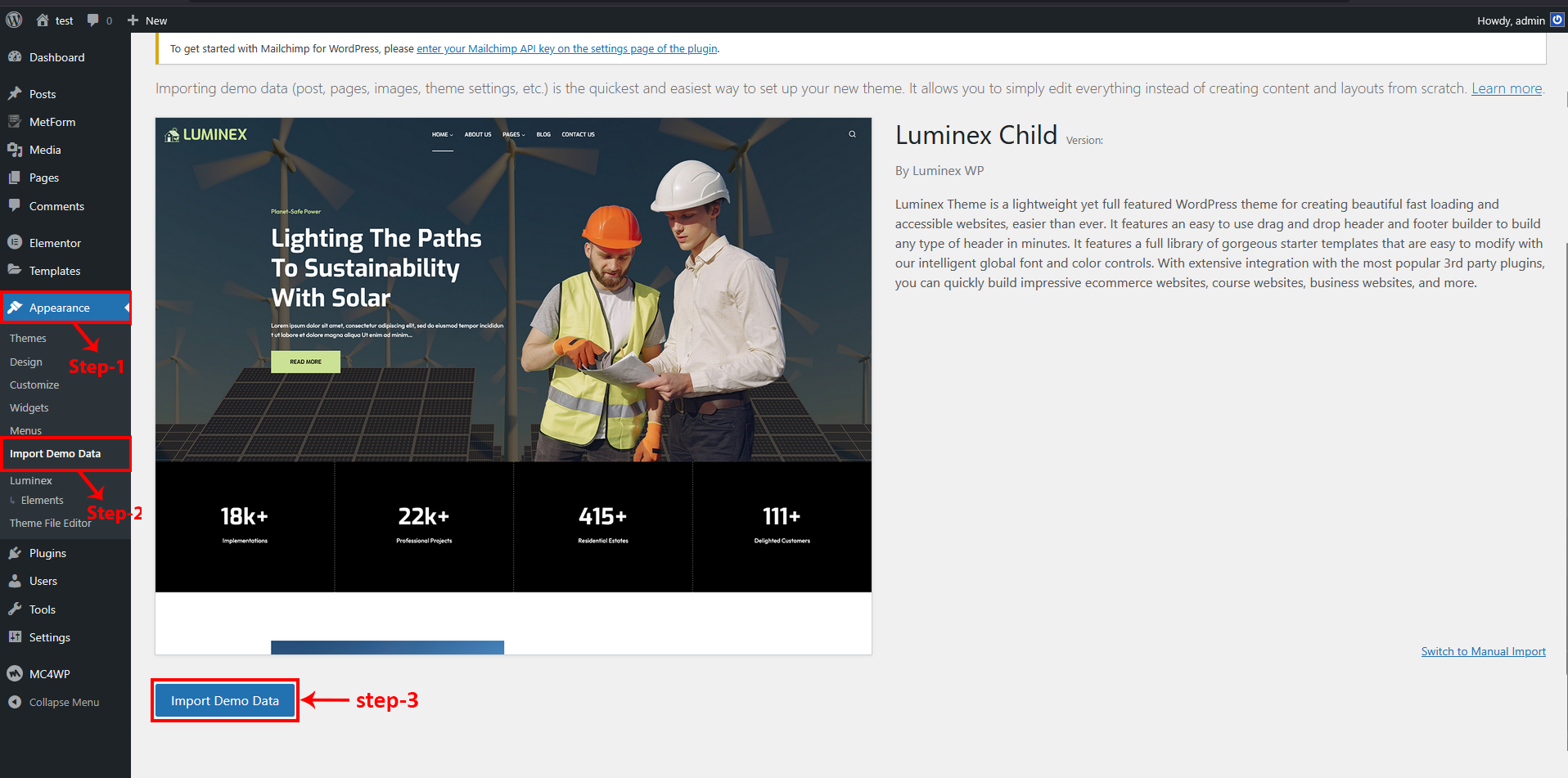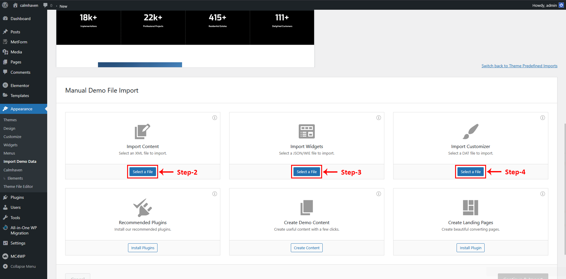 2 From the dashboard go to Appearance -> Import Demo Data