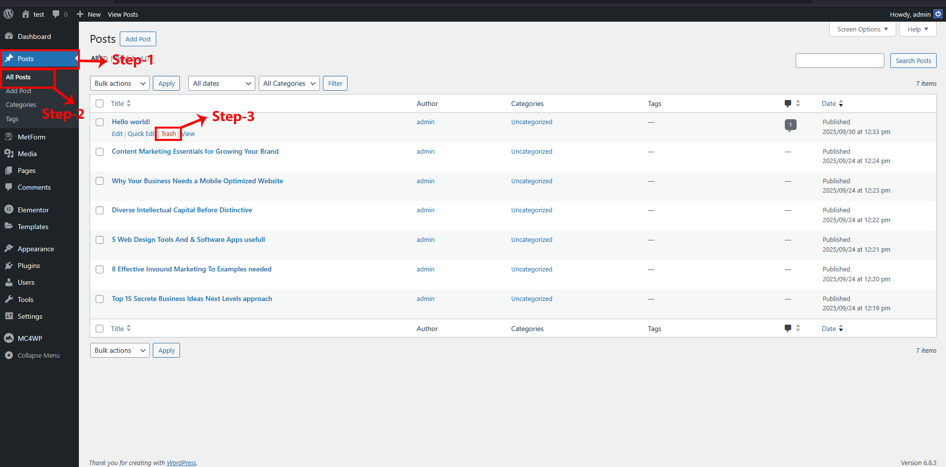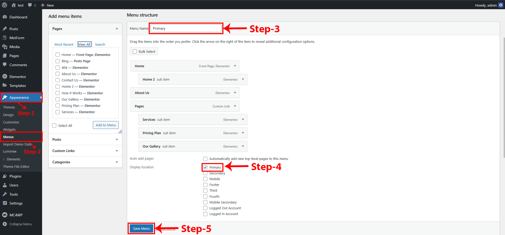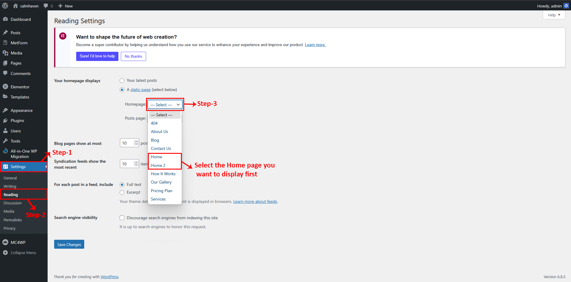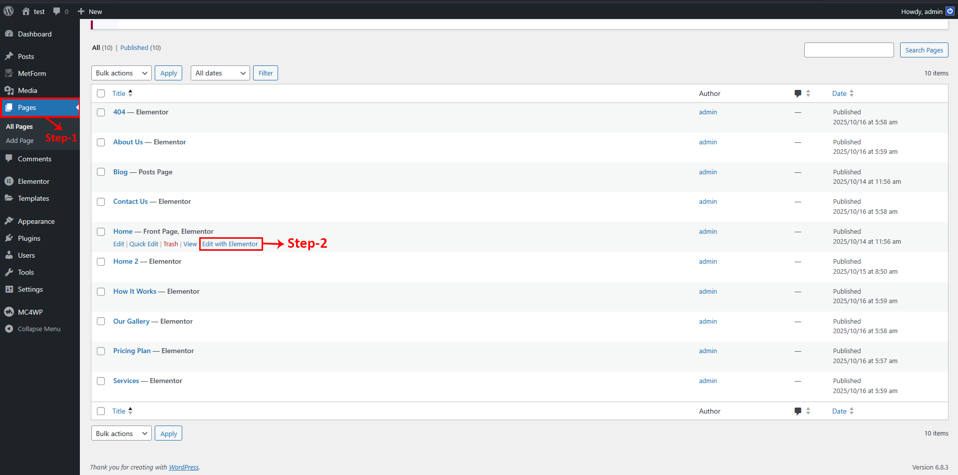 2 Hover over the Home page, and you will see a popup option. Click on "Edit with Elementor"