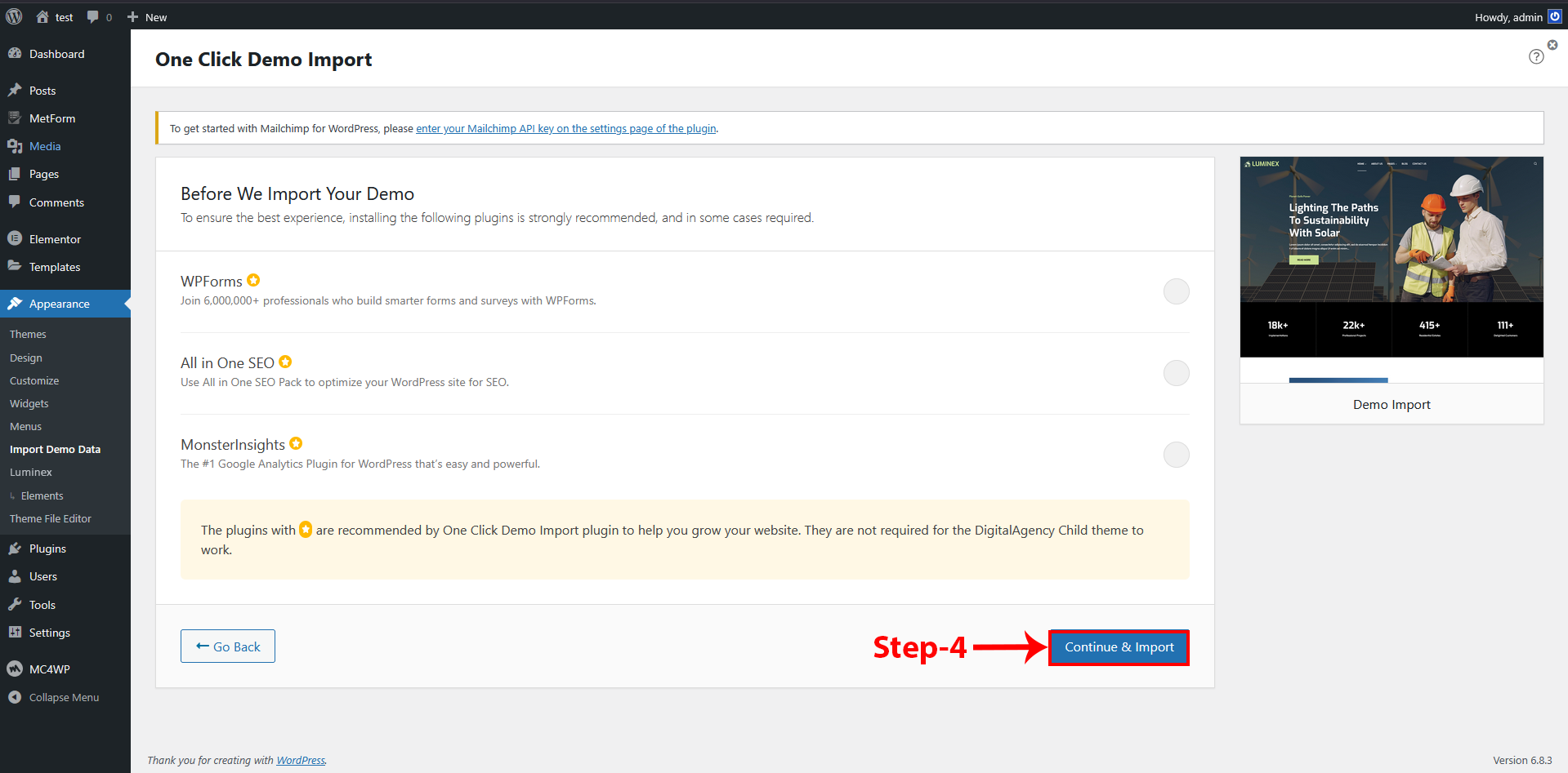 Note: Please remember that when you are done with the demo import, your some existing settings will be replaced by the demo contents Like: Your menu, Customizer. So it is recommended that you should only do this in fresh site.