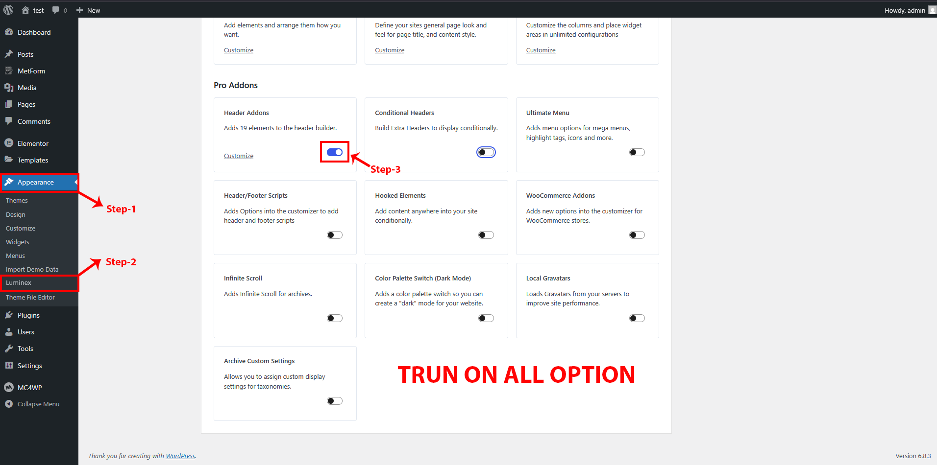 After installing all the required and recommended plugins for the Luminex theme, it is important to activate all the PRO add-ons. These add-ons unlock additional features and enhanced functionality, allowing you to take full advantage of the theme’s capabilities.