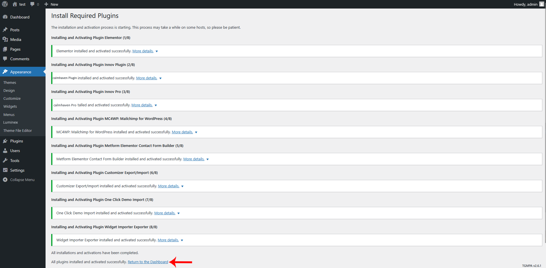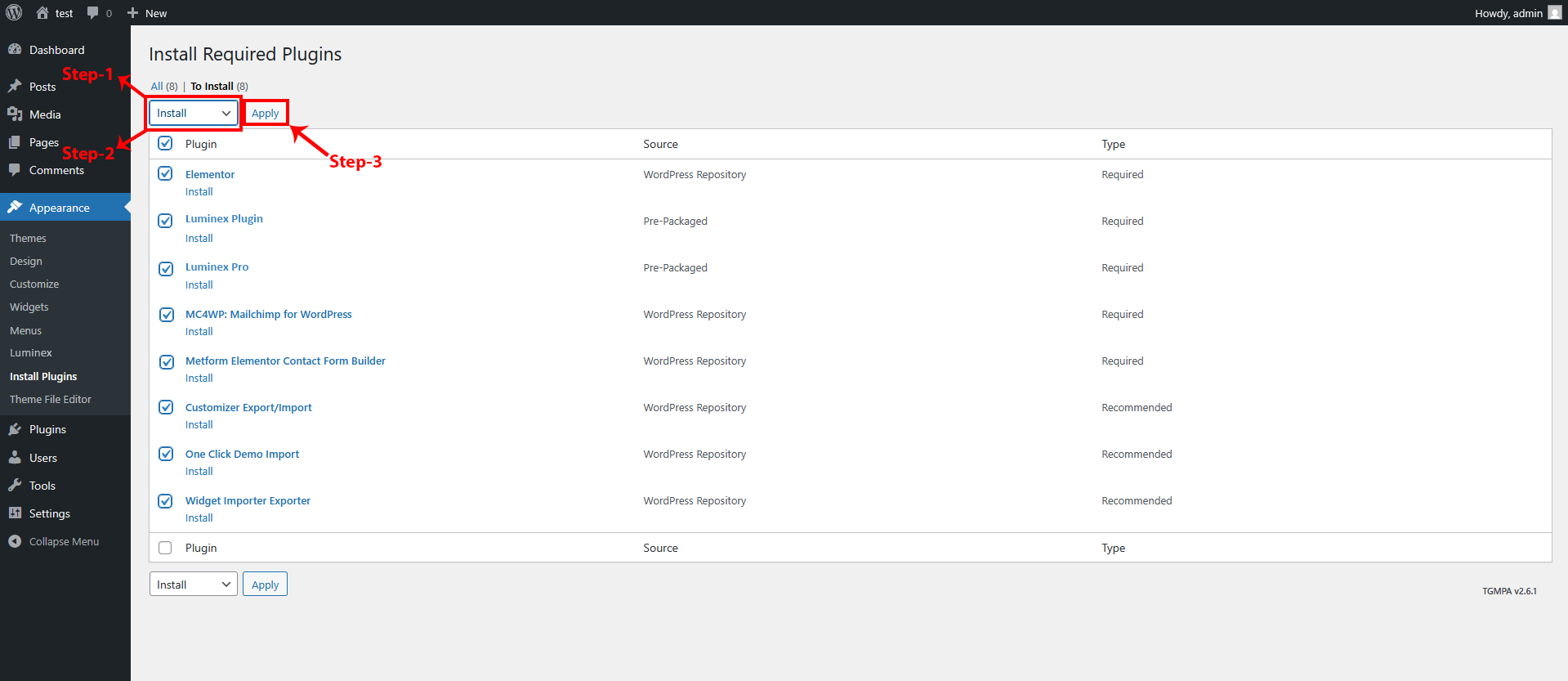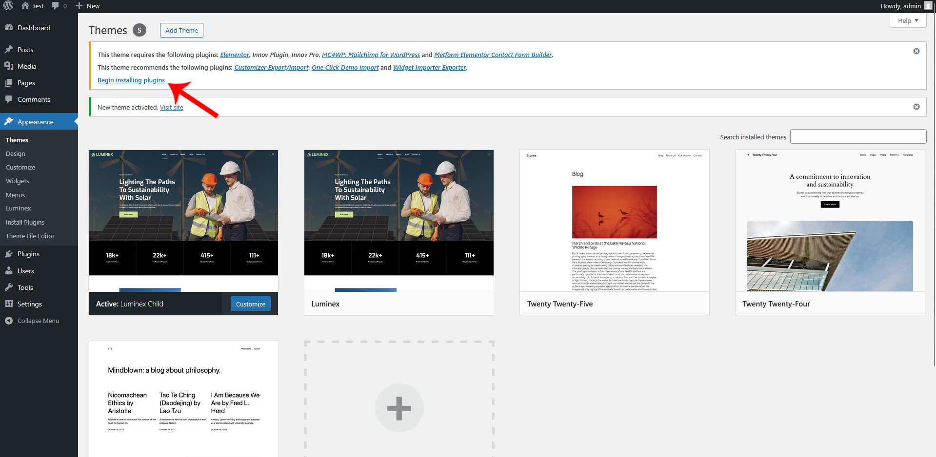 After activating the Luminex child theme, it is important to install all the required and recommended plugins. These plugins add essential functionality and advanced features that are not included in the base WordPress installation.