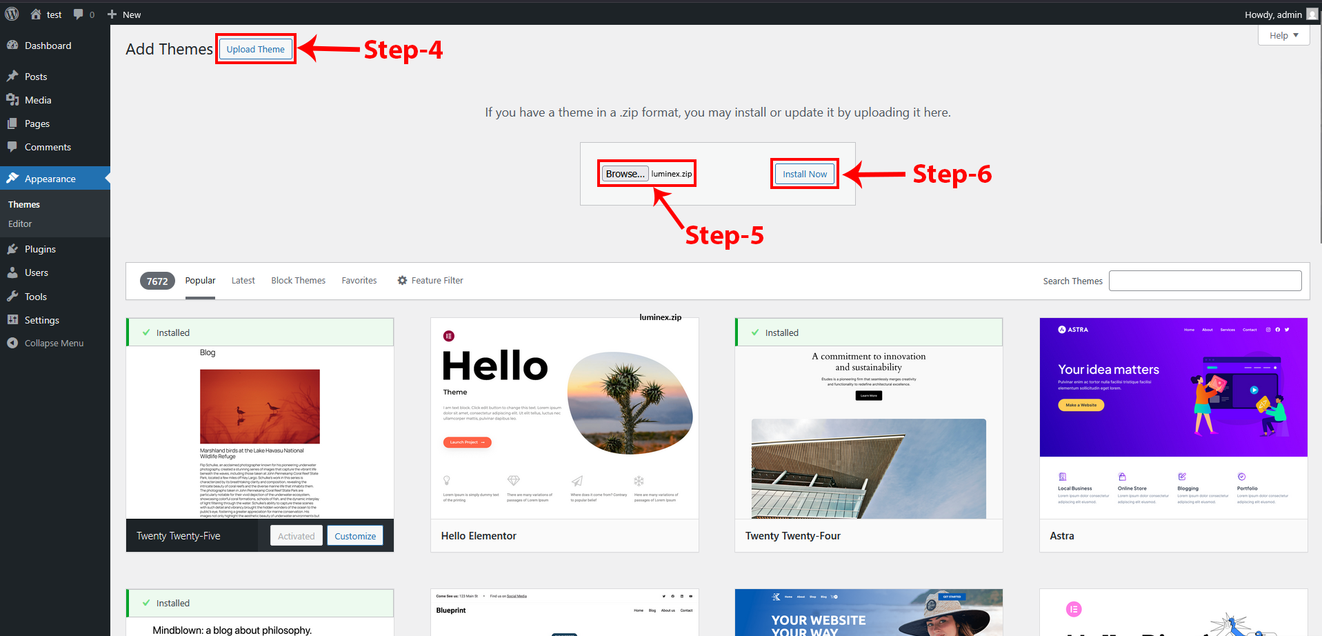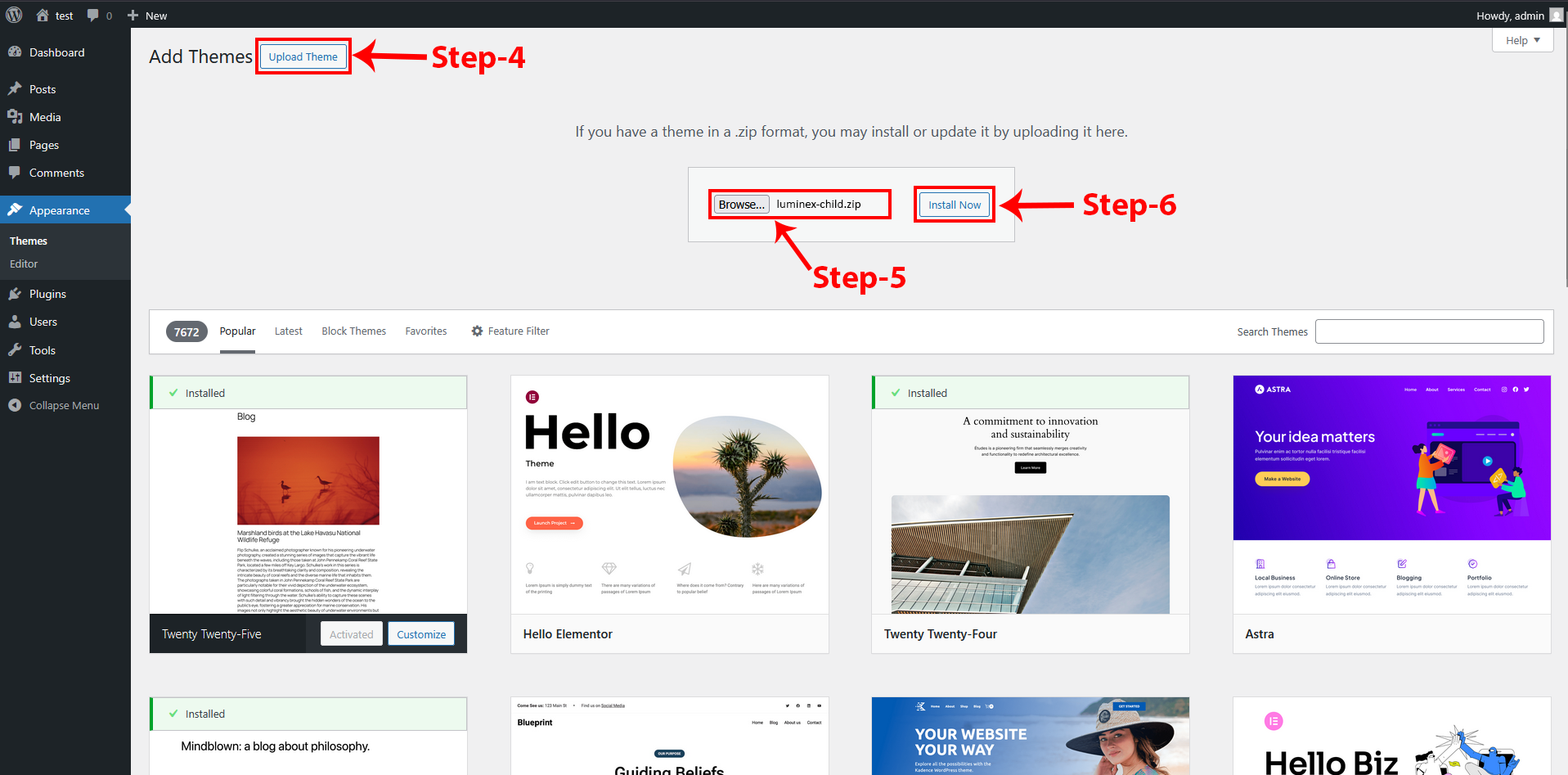 Click on “Choose File” and select Luminex-child.zip and Click on “Install Now”.